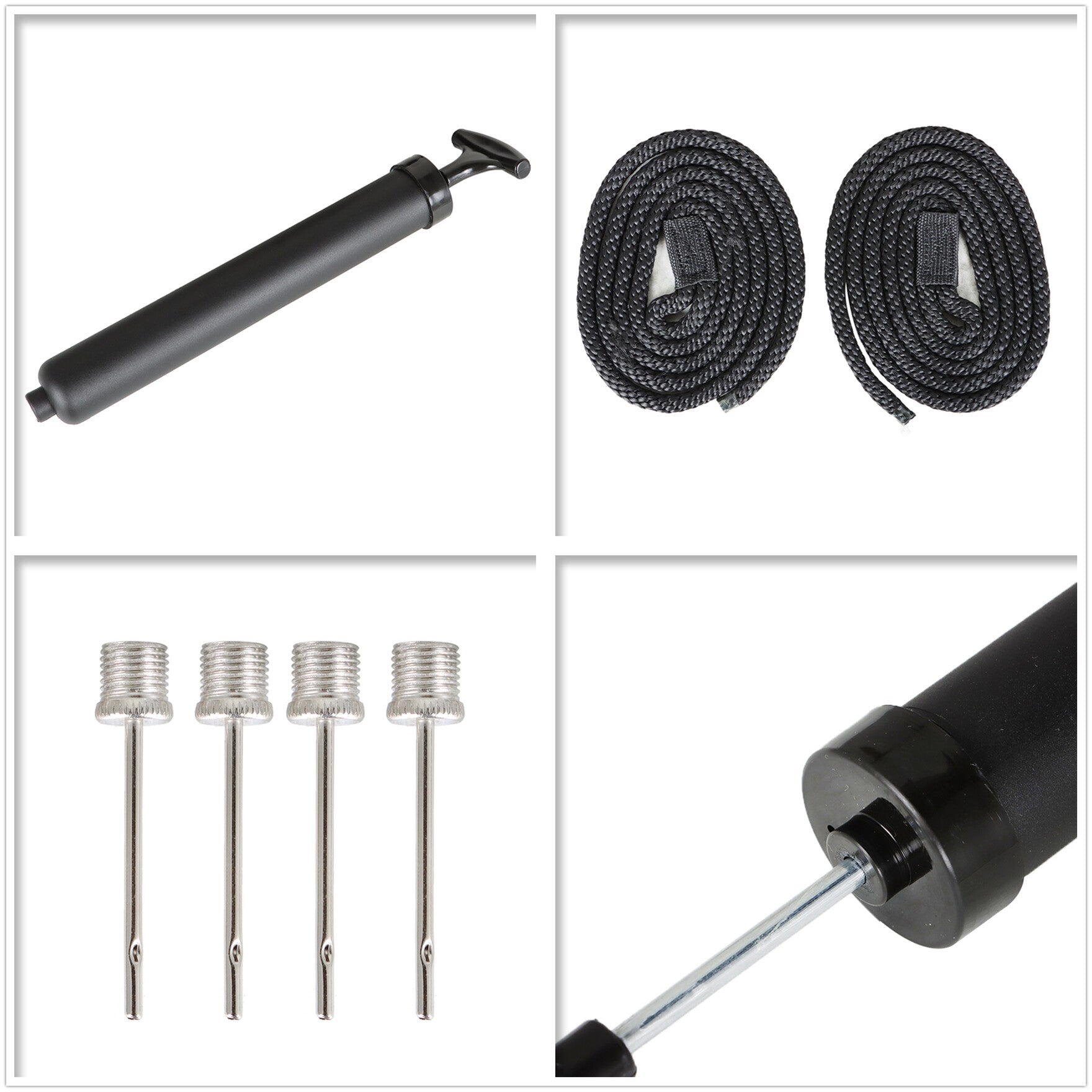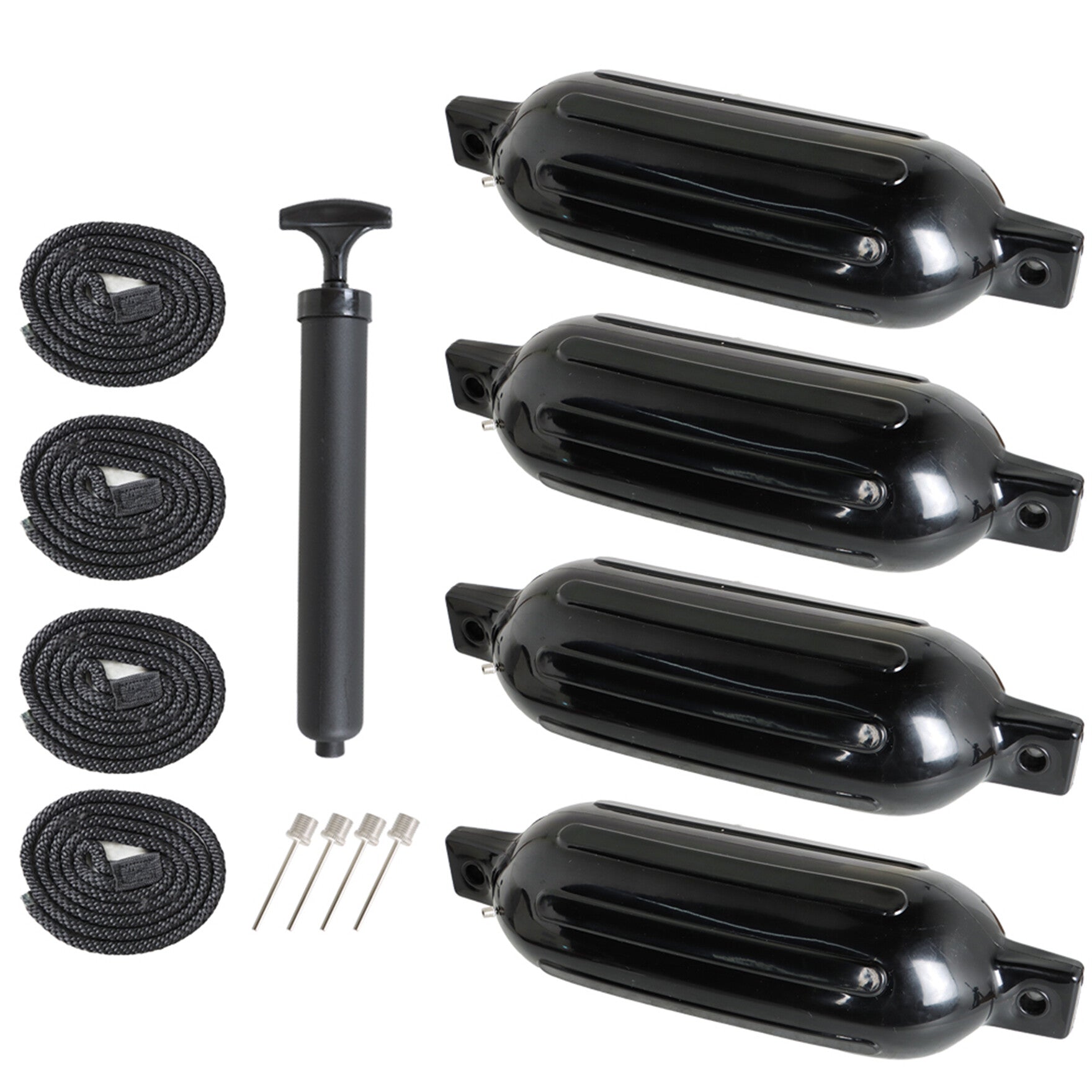 Includes 4-pack 8.5 x 27 inches fenders, 4-pack 5.2 rope, 4 inflating needles and a pump to inflate