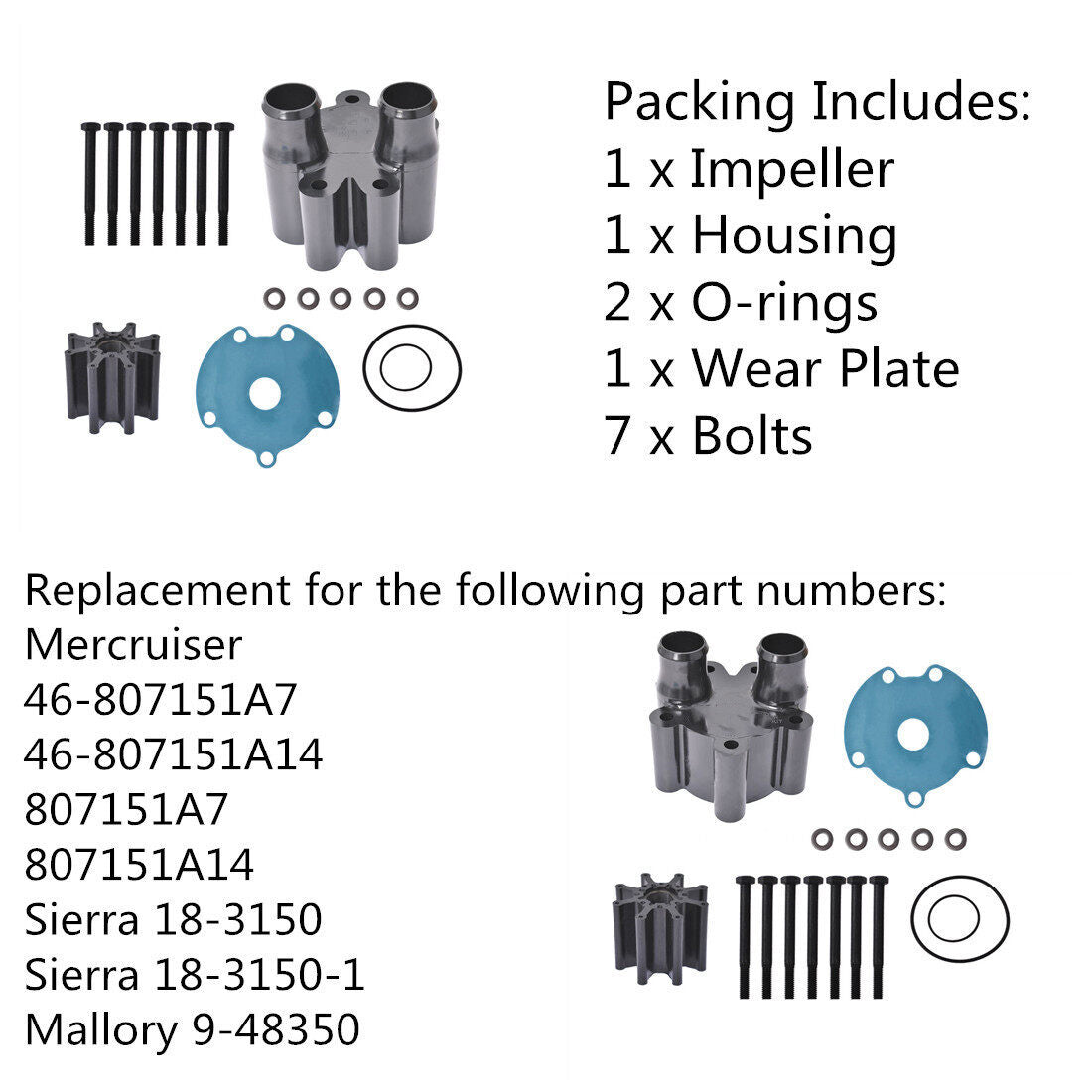 Water pump impeller kit & housing sea water pump impeller repair parts replacement for Mercury Mariner Bravo Raw 46-807151A14 18-3150