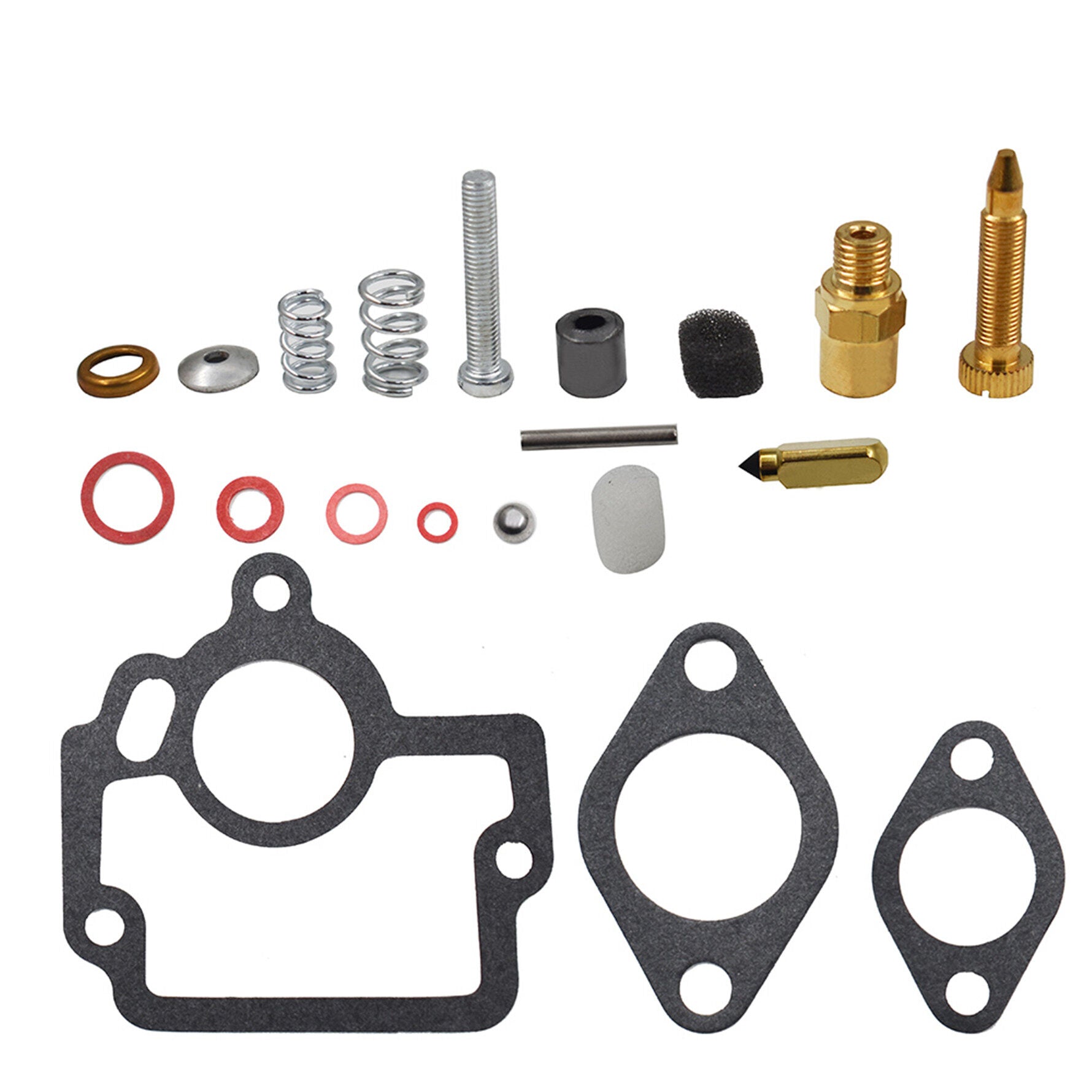 In addition to comparable kits, it includes the throttle housing gasket, the idle set screw and spring and original type graphite packing for the load needle instead of cheap leaky rubber, the float pin will be stainless steel or brass so it won't corrode like the others